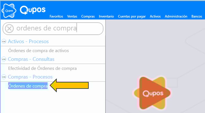 1. Ingresar en la pantalla de Órdenes de compra.En el menú principal del sistema, digitamos la palabra órdenes de compra o bien podemos hacerlos desde el módulo de Compras -Procesos-Órdenes de compra.