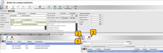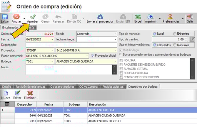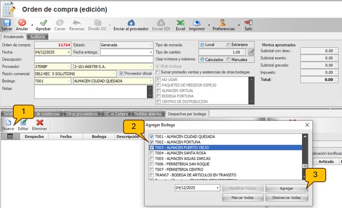Ingresar a la pestaña de Despachos por bodega para definir las bodegas a las que se le va realizar la orden de compra.