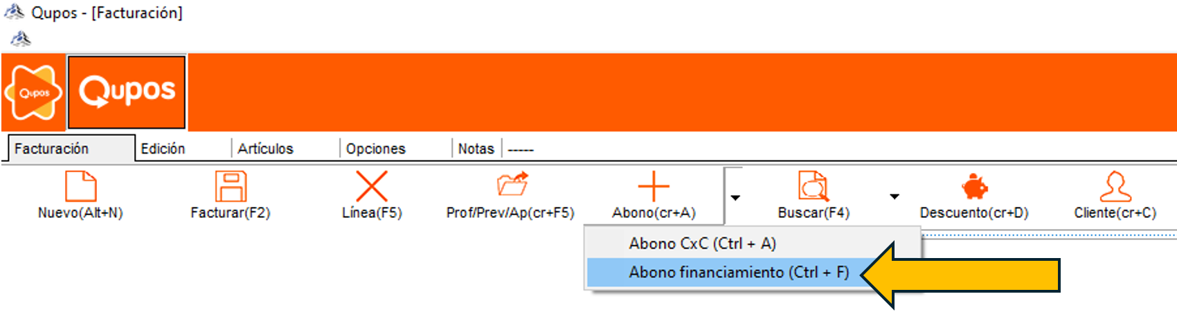 Una vez dentro de la pantalla de facturación debes ingresar a la pestaña de abonos e ingresar a la opción de abono financiamiento.