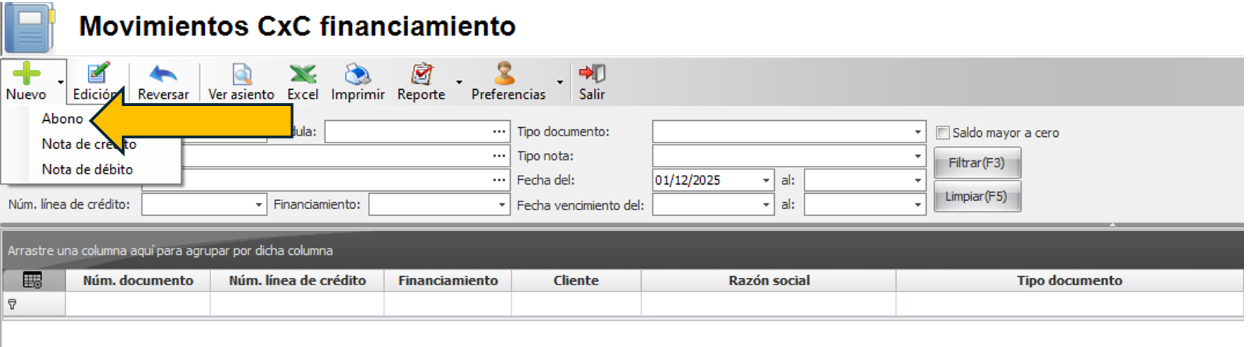 Dar clic en el botón de nuevo y luego proceder a escoger la opción de abono.