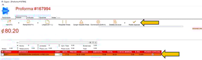 Desde la pantalla de Proformas es posible marcar que una venta corresponde a un pedido especial, permitiendo identificarla antes de convertirla en una transacción formal.