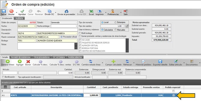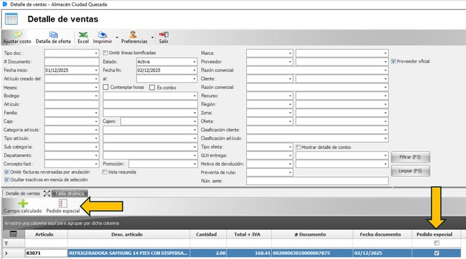 Una vez generado el movimiento, en el detalle de ventas se puede visualizar y confirmar que el registro quedó asignado como pedido especial. Y en caso de no haberlo realizado en pasos anteriores se puede seleccionar la línea e indicar que es un pedido especial solo que para este punto se deben de recalcular los promedios de ventas en la pantalla de bodegas ya que la venta ya se realizó y se debe recalcular para excluir nuevamente esa venta.