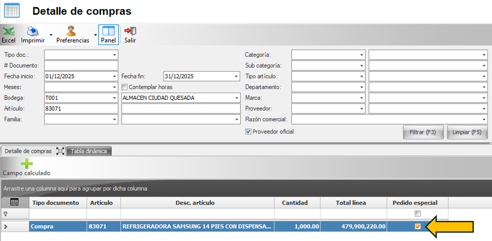 En la pantalla de registro de compras se puede verificar la llegada del artículo correspondiente a un pedido especial, completando así el ciclo del proceso.