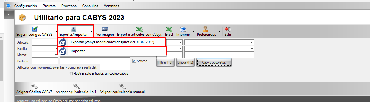 - Nota: El sistema brinda la opción de "Exportar/Importar". Esta opción permite que el usuario exporte en un archivo XML todos los artículos a los que se les cambió su código Cabys después del 01/02/2023, para luego poder importar ese mismo archivo XML en otra sucursal; siempre y cuando coincidan los códigos de los artículos.