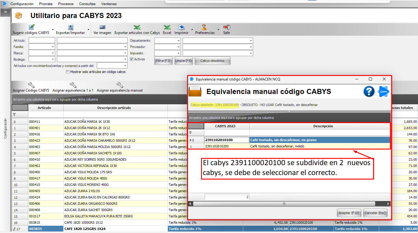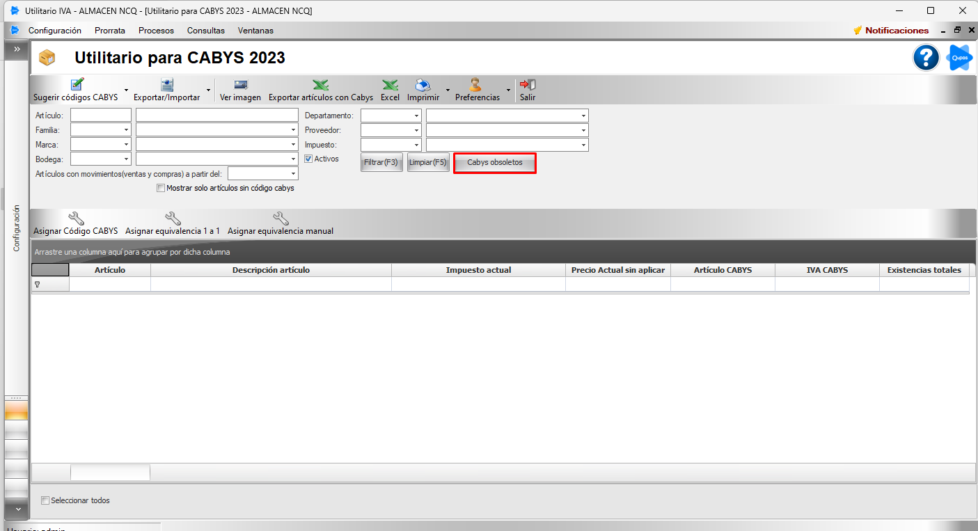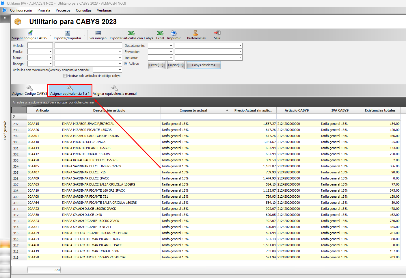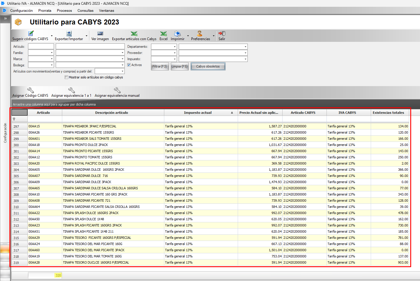 Para nuestro ejemplo se encontraron 320 artículos que tienen Cabys obsoletos.