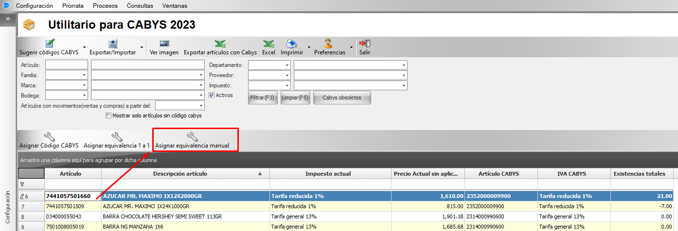 5. Luego de realizar el paso anterior van a quedar en la lista los artículos que no pudieron actualizar la equivalencia de 1 a 1, esto debido a que el código actual se subdivide en varios códigos Cabys nuevos más específicos. Para estos se debe de realizar el proceso manualmente con el botón de "Asignar equivalencia manual". Esta opción mostrará una pantalla emergente con los posibles códigos Cabys relacionados al código actual del artículo.