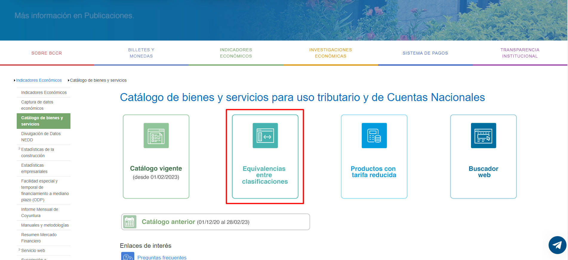 - Para consultar la lista de Cabys que van a actualizarse en el catálogo, puedes ingresar a revisarlo en el siguiente link: Catálogo de bienes y servicios para uso tributario y de Cuentas Nacionales en la opción de "Equivalencias entre clasificaciones".