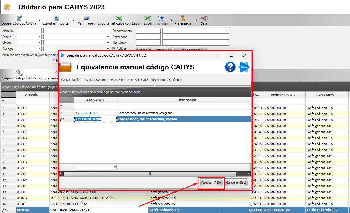 Se muestra una pantalla con los nuevos códigos Cabys y se debe de seleccionar el correcto.